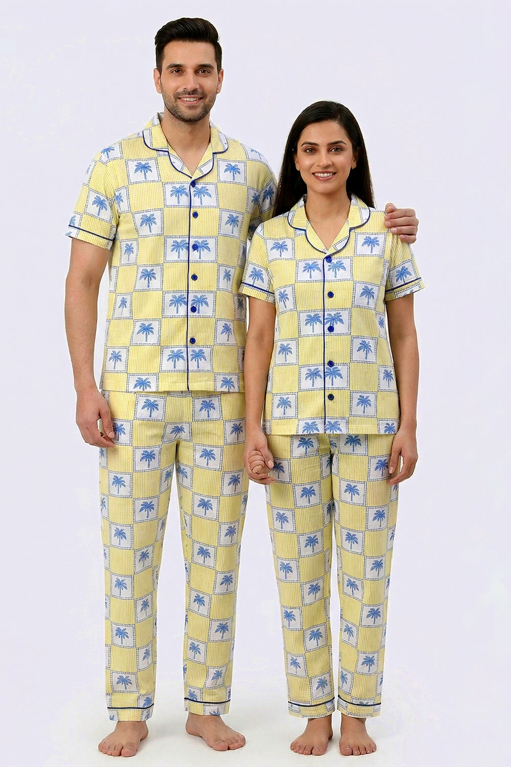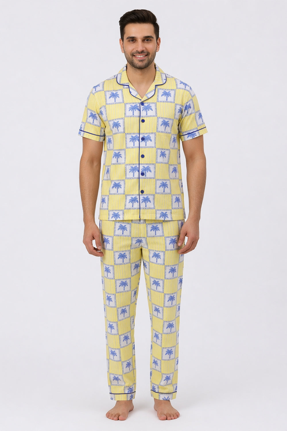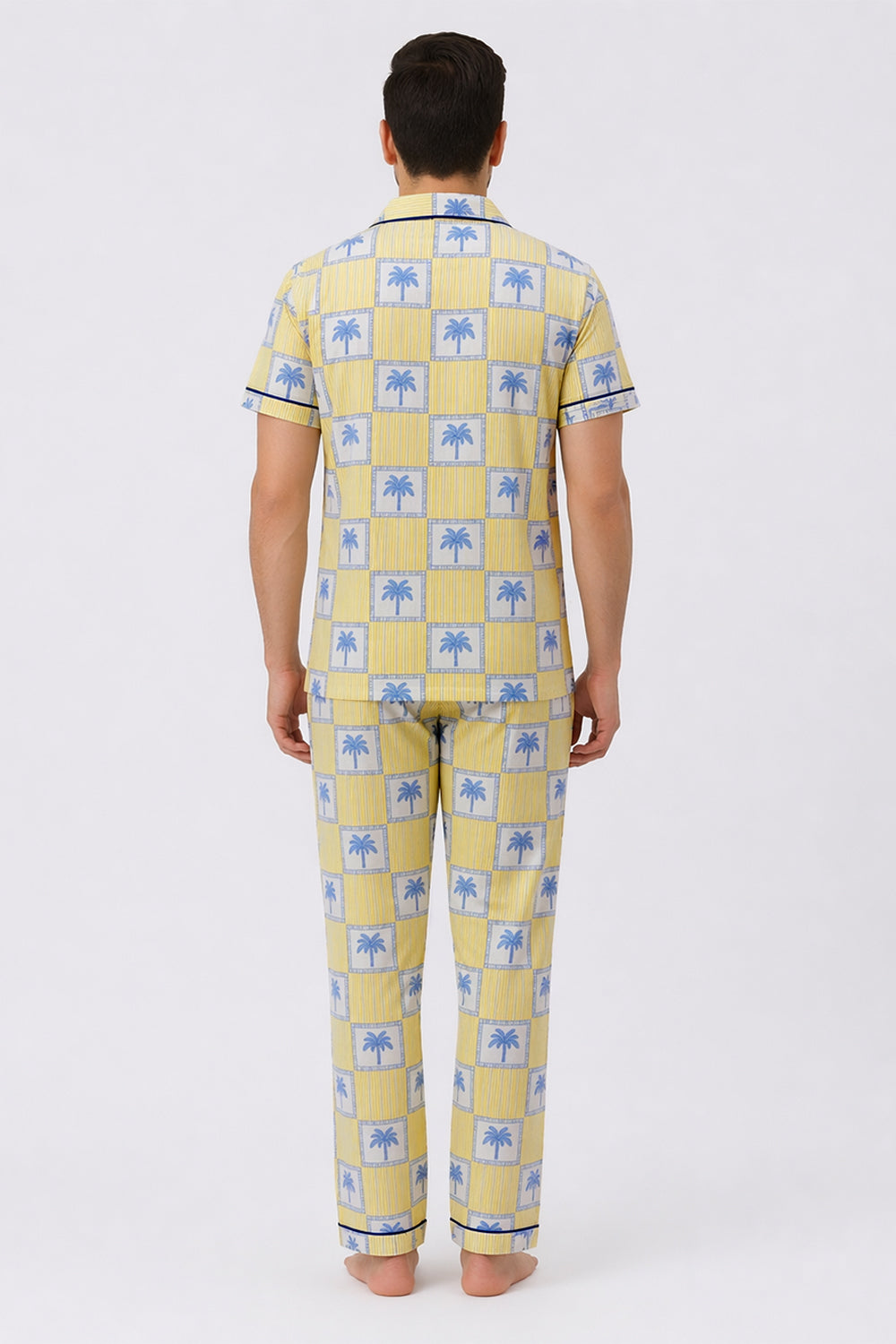Our bestselling notched collar pyjama set features a palm paradise print and elegant details.
