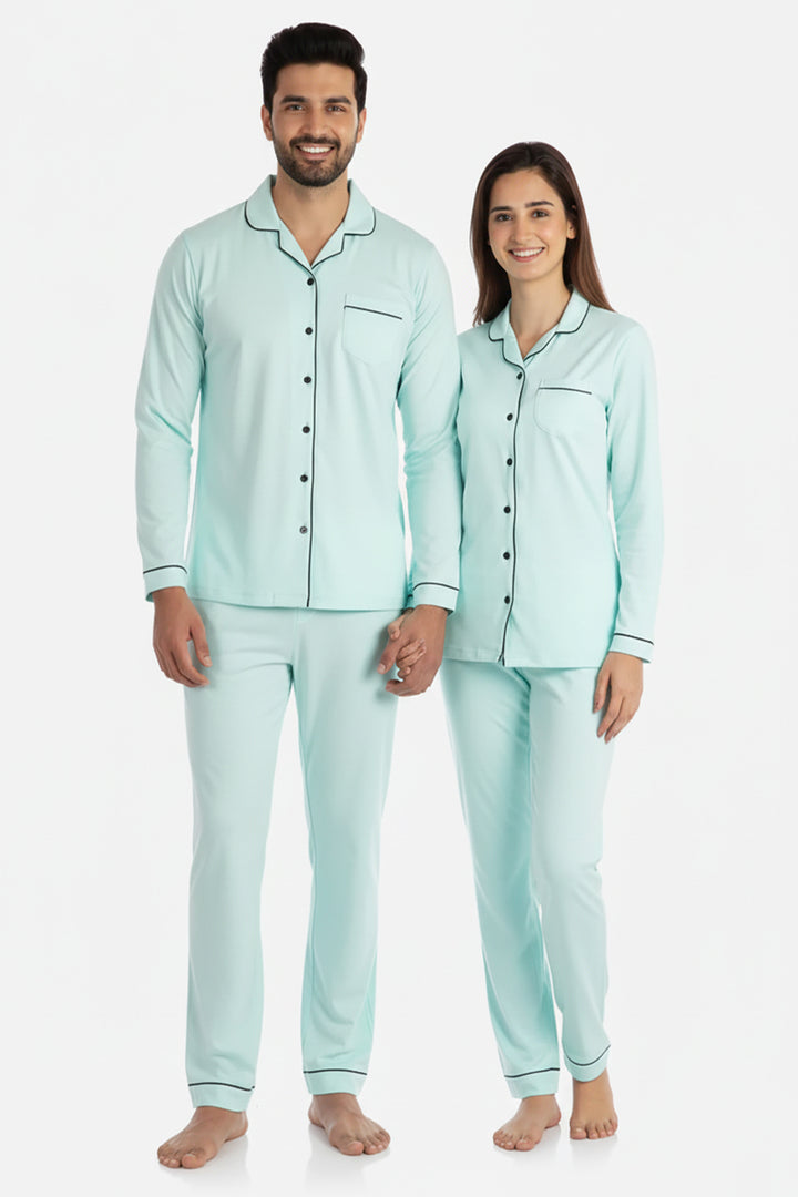 Our custom couples' pyjama set featuring a classic notched collar style in a soothing mint. You can never go wrong with this timeless style. Perfect gift for Valentine's, anniversaries, weddings and just because!