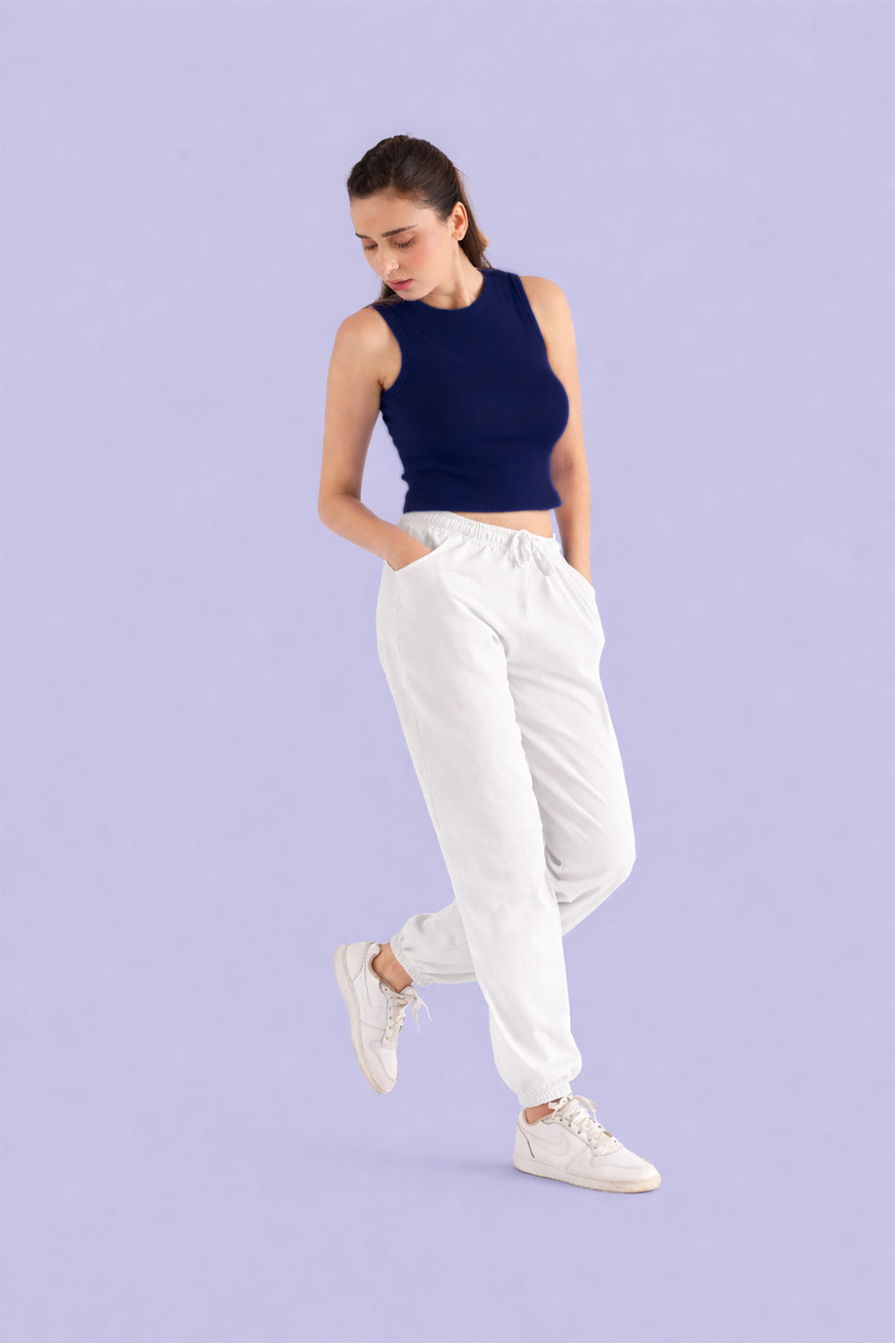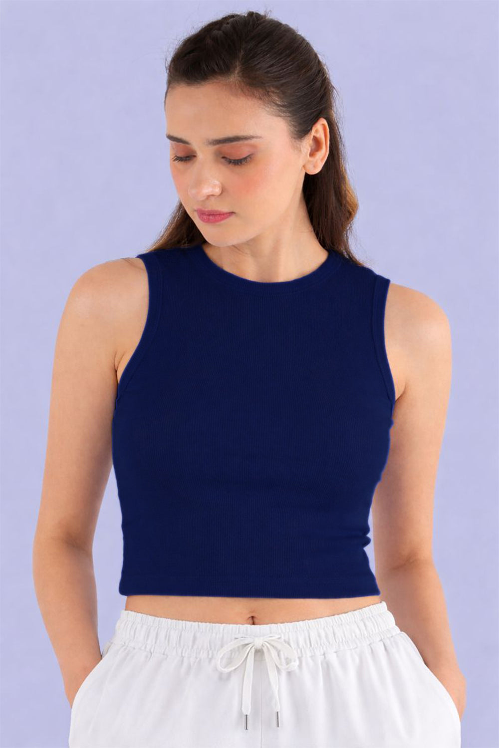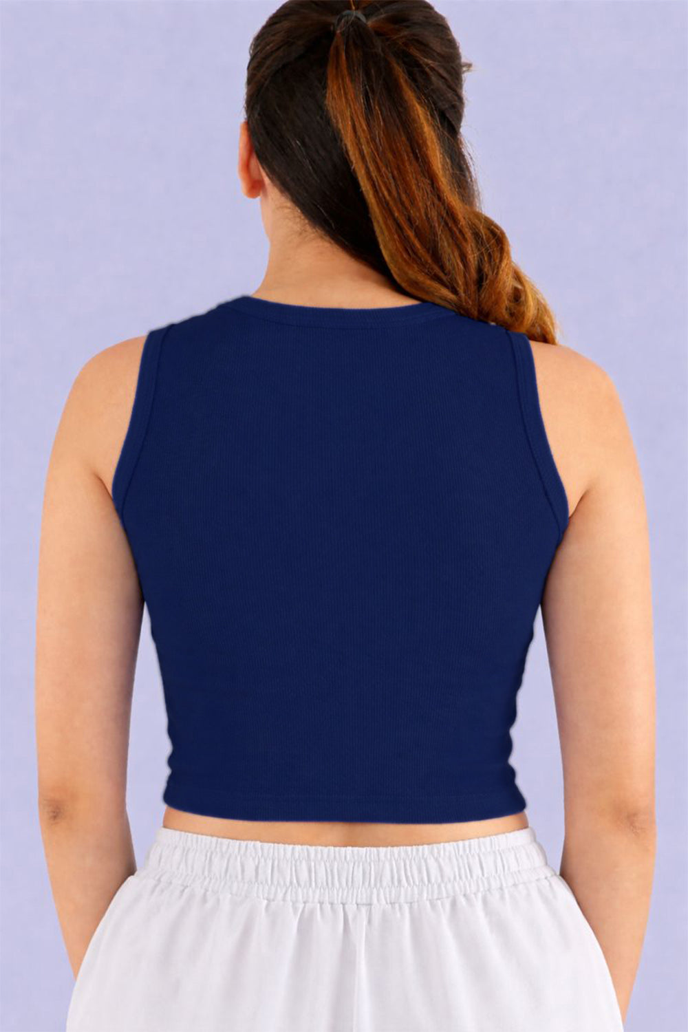 This classic sleeveless crop top features a high round neckline and a ribbed texture for a sleek, fitted look. Made from soft, stretchable fabric, it ensures both comfort and style. Perfect for pairing with high-waisted jeans, shorts, or skirts, this versatile piece is an essential addition to any wardrobe. Whether you're going for a casual day out or a sporty vibe, this crop top offers endless styling possibilites.